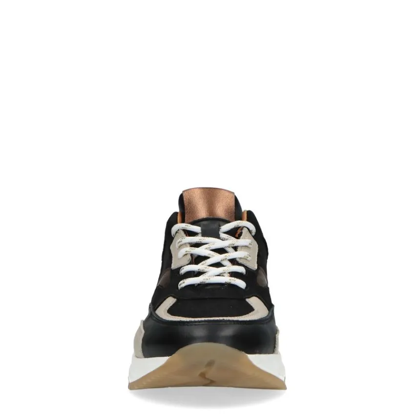 Zwarte leren sneakers van Manfield met zool van 4,5 cm en een uitneembare binnenzool. We adviseren als verzorging en bescherming de Collonil Carbon Pro.