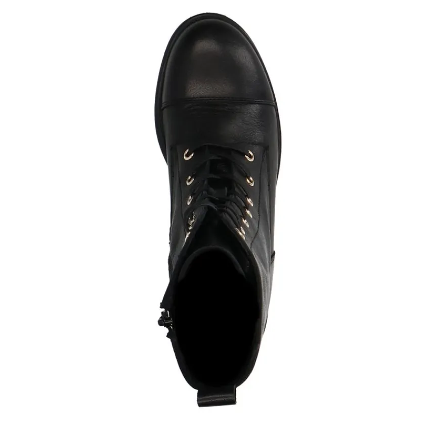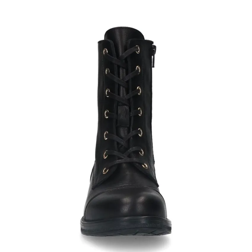 Zwarte leren veterlaarsjes van Manfield. Deze veterlaarsjes zijn gemaakt van soepel leer en daarom raden we je aan deze veterlaarsjes te verzorgen en beschermen met de Collonil Carbon Pro. Deze veterlaarsjes zijn voorzien van een ritssluiting en hebben een subtiele hak met hoogte van 1,5 cm.