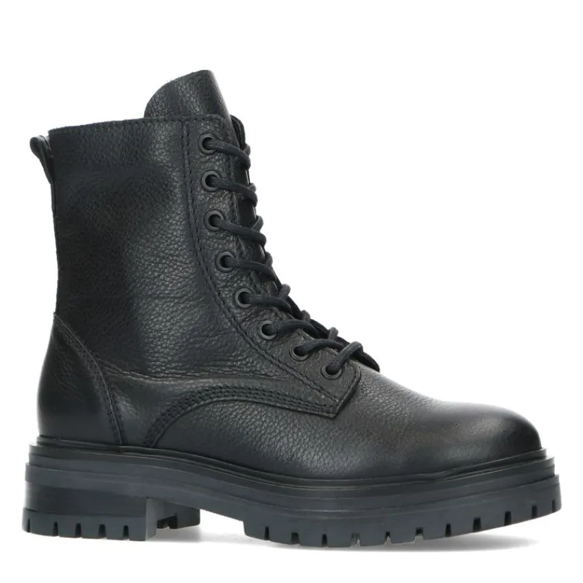 Zwarte veterlaarsjes van Manfield. De buitenkant en binnenkant zijn beide volledig gemaakt van leer, waardoor de veterlaarsjes een stoere uitstraling krijgen. Aan de binnenzijde zit een rits en je kunt ze strakker aantrekken middels de veters. De plateauzool heeft een hoogte van 5 cm en is grof afgewerkt. Draag ze onder een jurkje en maak gebruik van de juiste onderhoudsproducten.