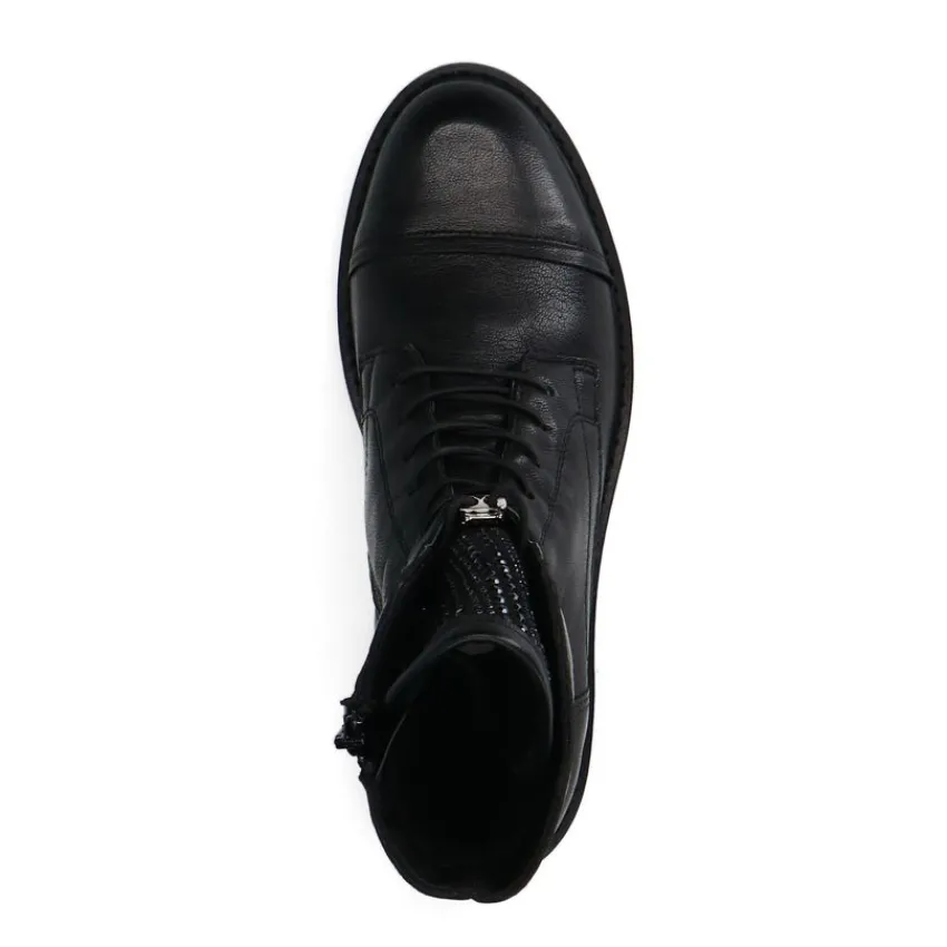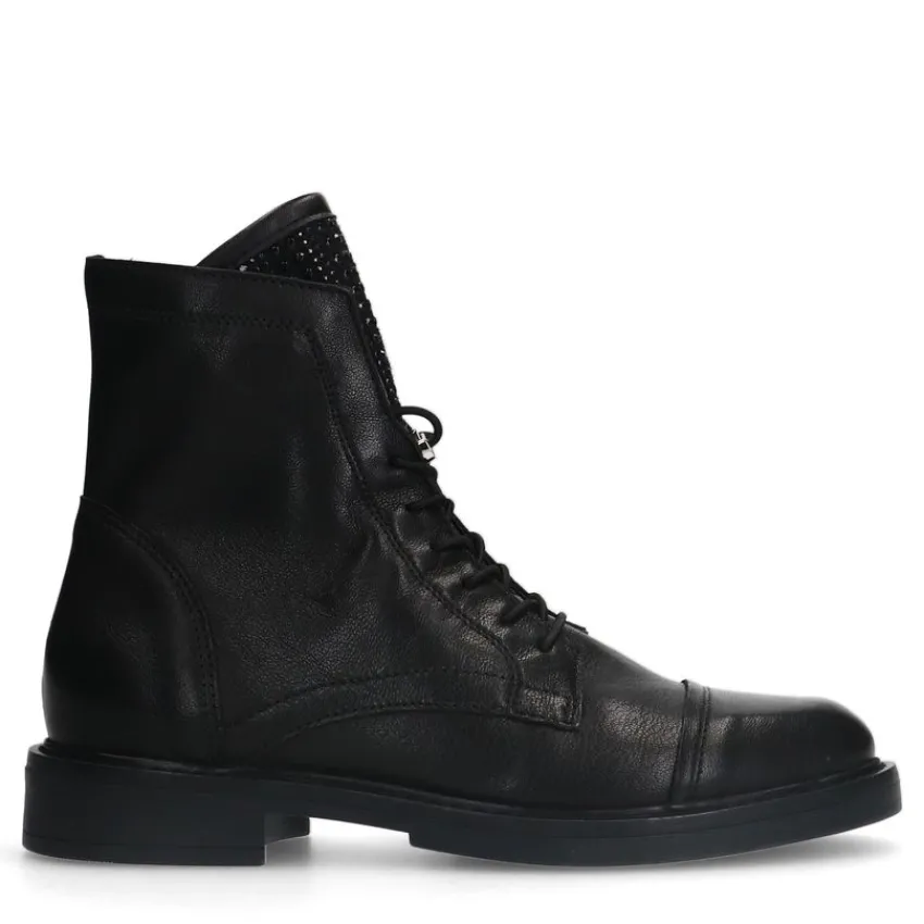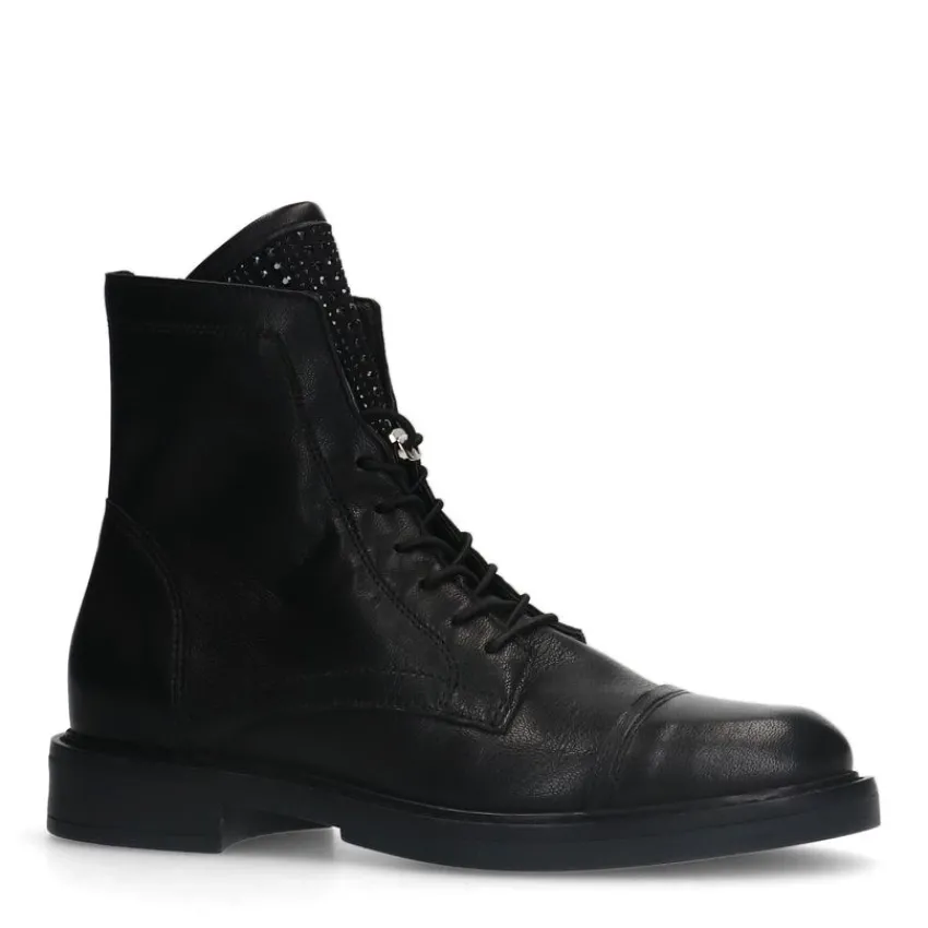 Zwarte leren veterlaarsjes van Manfield met strass detail. De veterlaarsjes hebben een ritssluiting aan de binnenzijde en een platte hak van 2 cm. We adviseren als verzorging en bescherming de Collonil Carbon Pro.