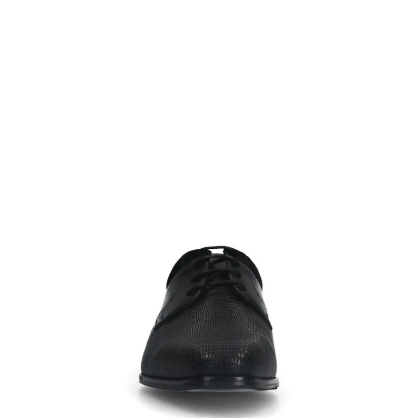 Zwarte leren veterschoenen met zacht detail van Manfield. Deze derby veterschoenen hebben een platte hak van 2 cm. We adviseren als verzorging en bescherming de Collonil Carbon Pro.