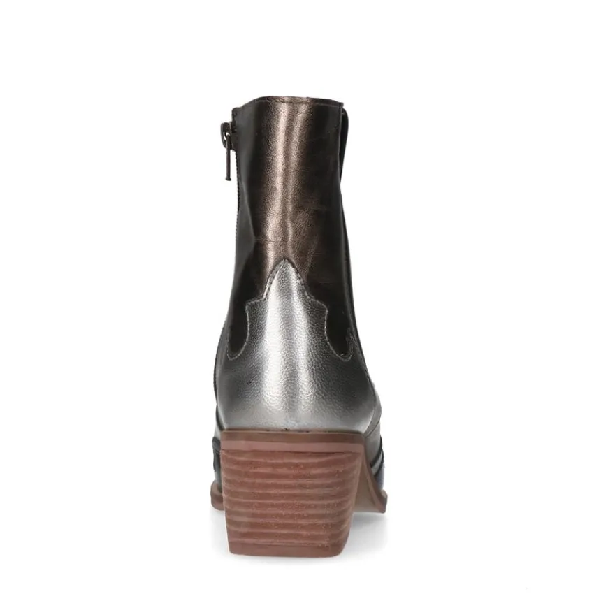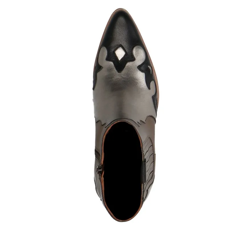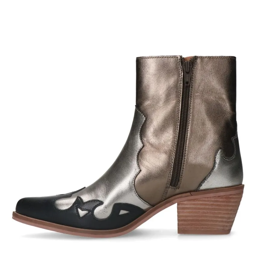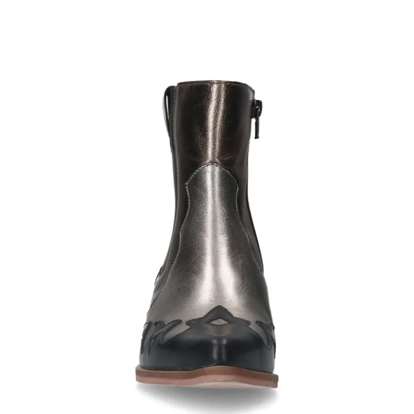 Zwarte metallic leren cowboy laarzen van Manfield met een schuin afgesneden blokhak van 5 cm en een puntige neus. De laarzen hebben een uniek design en ritssluiting aan de binnenzijde. We adviseren als verzorging en bescherming de Collonil Metallic spray.