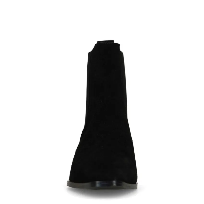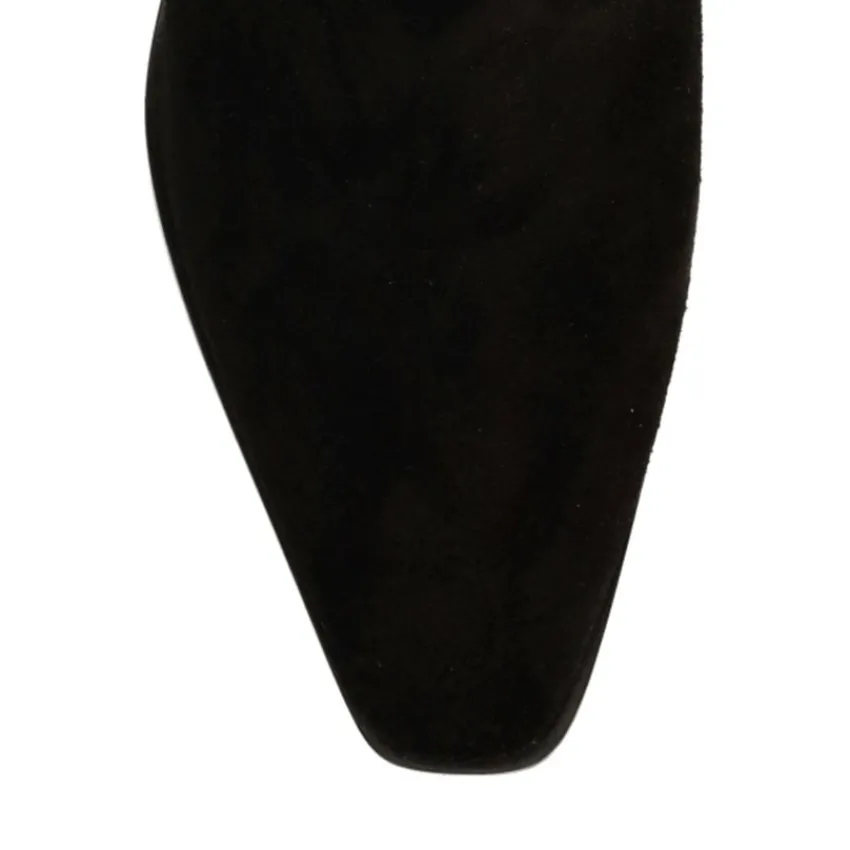 Zwarte suède chelsea boots van Manfield met een vierkante neus en platte blokhak van 3 cm. We adviseren als verzorging en bescherming de suède/nubuck spray in transparant.