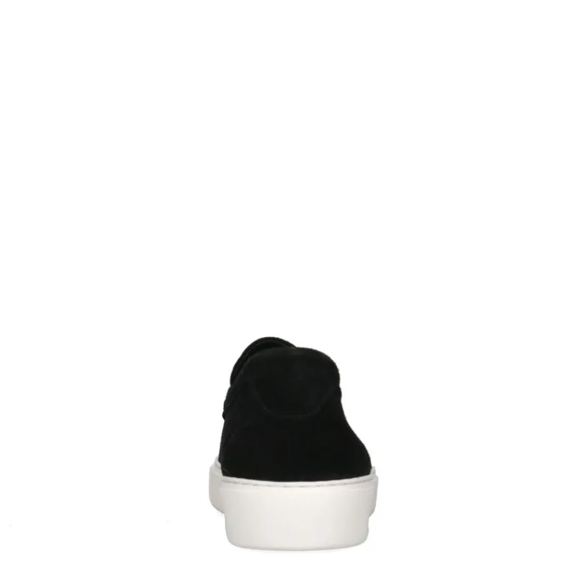 Zwarte suède loafers met sportieve zool van Manfield. Deze loafers zijn voorzien van een witte zool met hoogte van 3 cm, wat deze loafers een sportieve uitstraling geeft. De loafers zijn gemaakt van suède, daarom raden we je aan deze instappers te verzorgen en beschermen met de Suède/Nubuck spray in transparant. Uniek aan deze loafers zijn de details in de stiksels en de afdruk op de voorvoet.