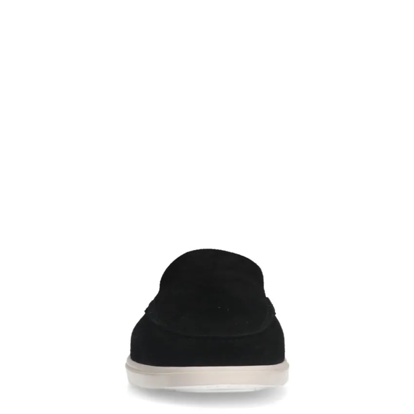 Zwarte suède loafers van Manfield met een platte hak van 2 cm. We adviseren als verzorging en bescherming de suède/nubuck spray in transparant.