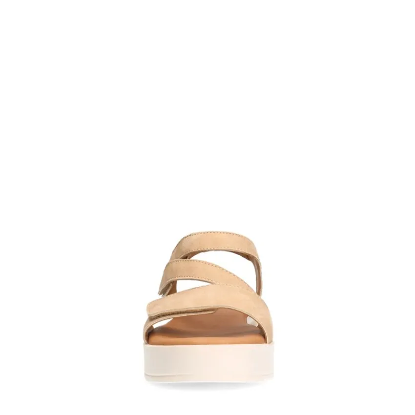 Beige suède sandalen van No Stress met witte plateauzool van 3 cm en klittenband sluiting rondom de enkel en op de voorvoet. We adviseren als verzorging en bescherming de suède/nubuck spray in transparant.