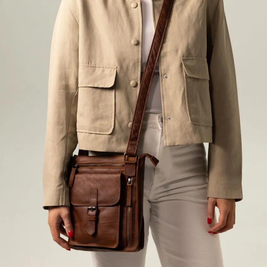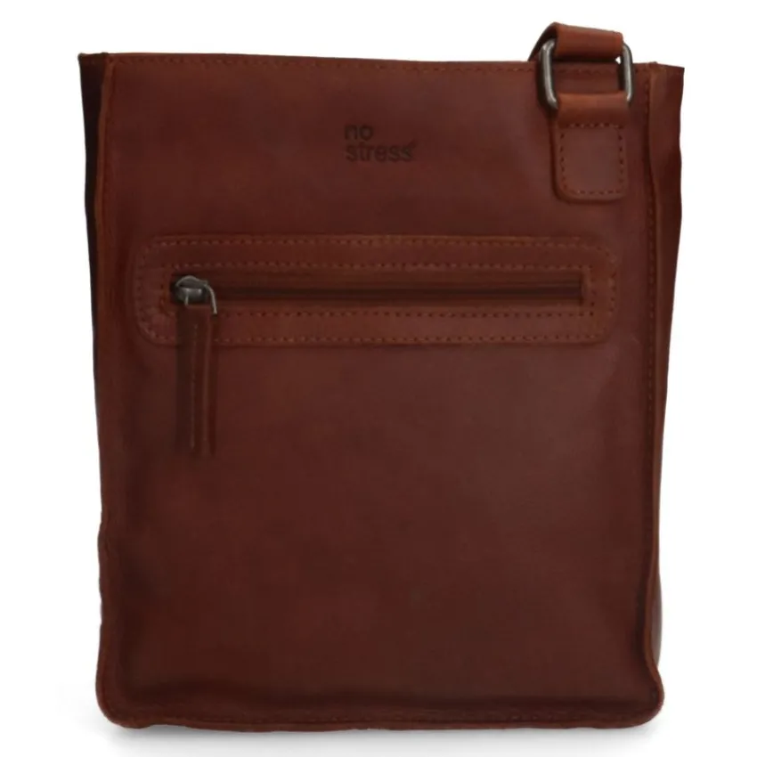 Cognac leren schoudertas van het merk No Stress. De afmeting van deze tas is 20x24x5 cm (BxHxD), voorzien van meerdere aparte vakken die sluiten door middel van een ritssluiting. Ook zit er een verstelbare band bij van 135 cm. We adviseren als verzorging en bescherming de Collonil Carbon Pro.