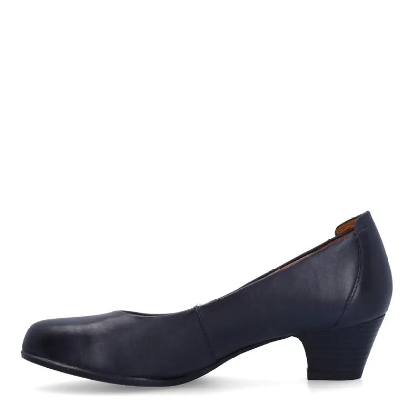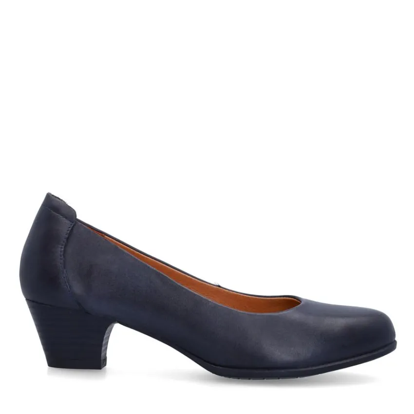 Navy leren pumps van het merk No stress. De pumps hebben een memory foam voetbed en een lage hak van 4 cm hoog.