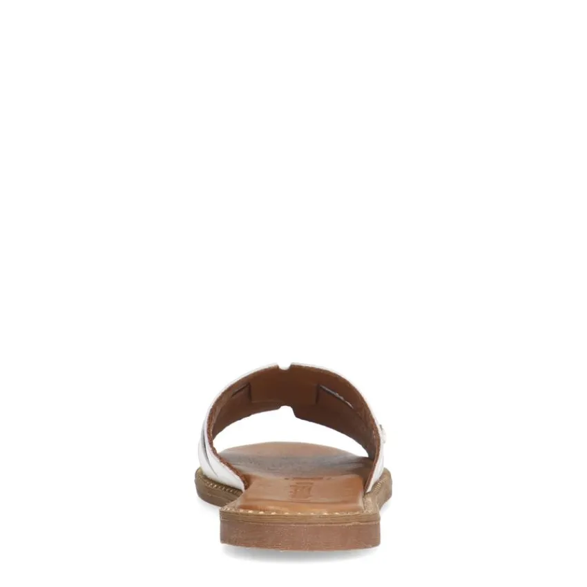 Witte leren slippers van het merk No Stress met een memory foam voetbed en brede band over de voorvoet. We adviseren als verzorging en bescherming de Colonil Carbon Pro.