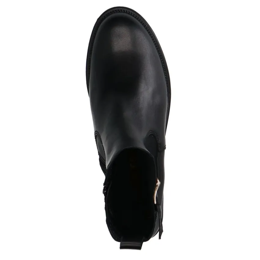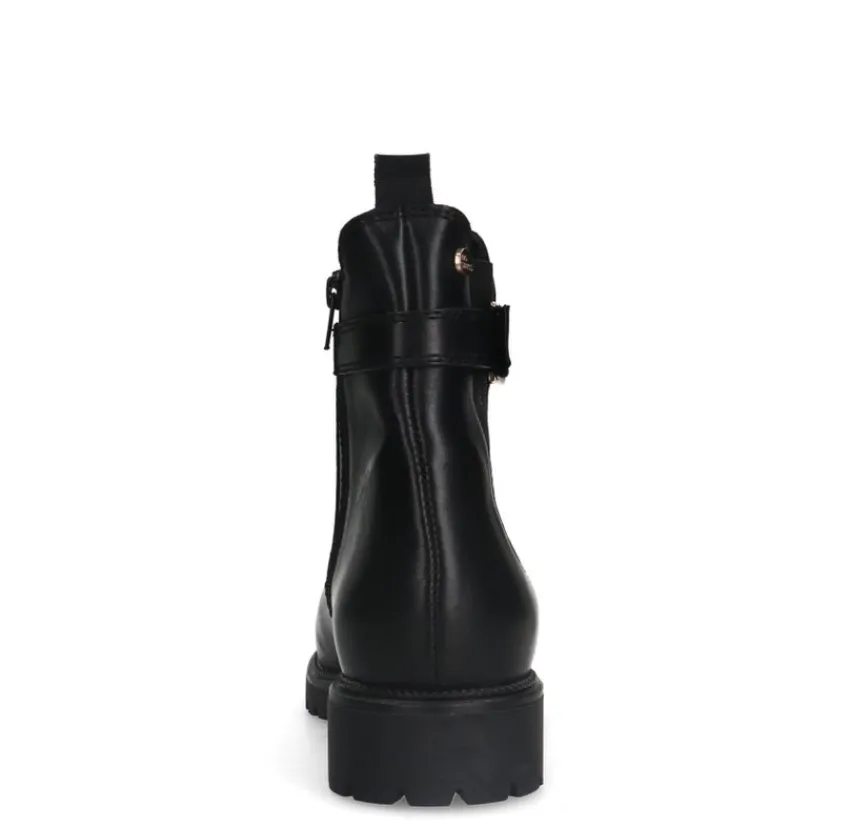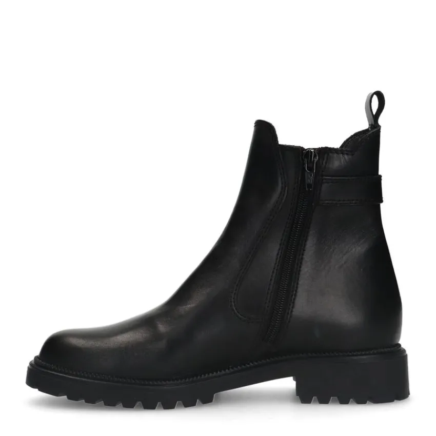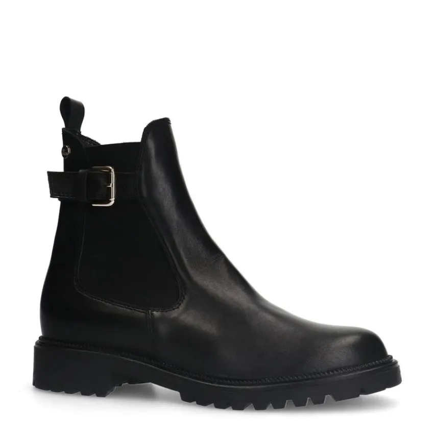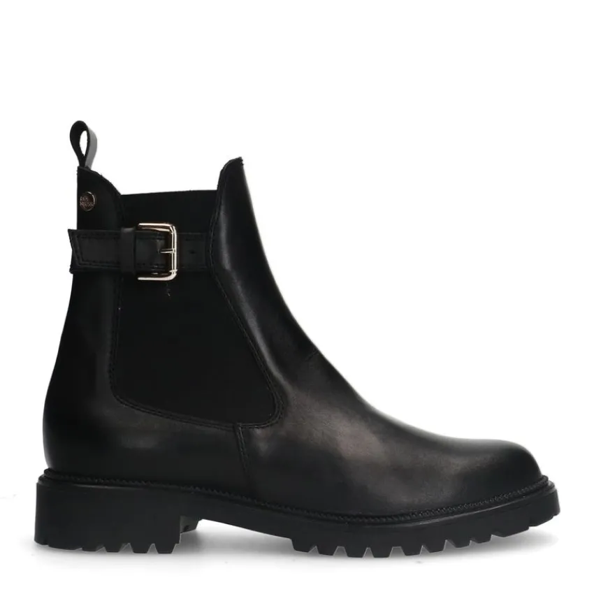 Zwarte leren chelsea boots met gesp detail van het merk No Stress. De boots hebben een platte hak van 2 cm, een ritssluiting aan de binnenzijde en de binnenkant is gemaakt van textiel. We adviseren als verzorging en bescherming de Collonil Carbon Pro.