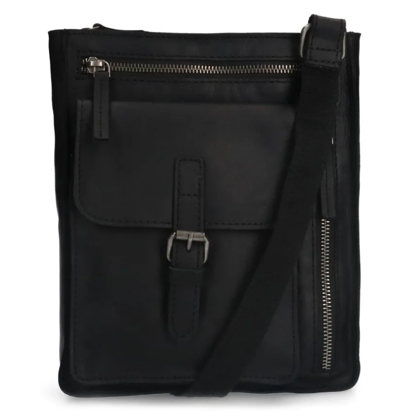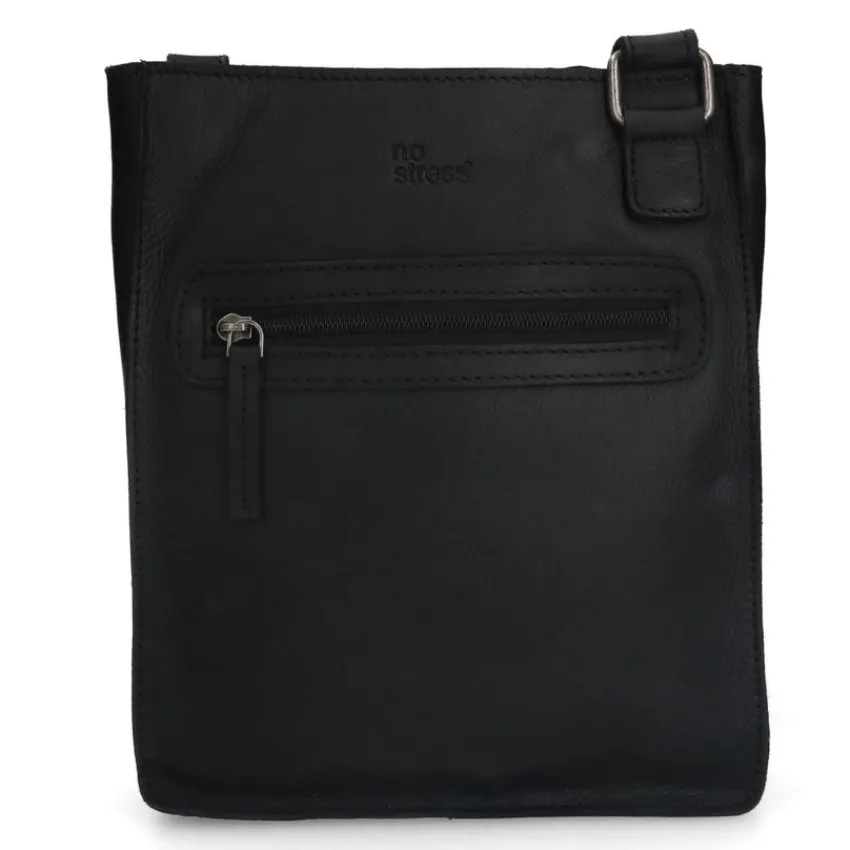 Zwarte leren schoudertas van het merk No Stress. De afmeting van deze tas is 20x24x5 cm (BxHxD), voorzien van meerdere aparte vakken die sluiten door middel van een ritssluiting. Ook zit er een verstelbare band bij van 135 cm. We adviseren als verzorging en bescherming de Collonil Carbon Pro.
