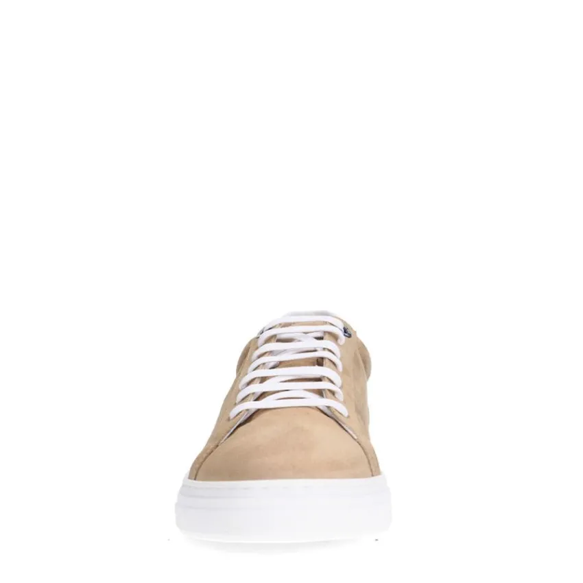 Beige suède sneakers van het merk Van Lier met witte zool van 2 cm. We adviseren als verzorging en bescherming de suède/nubuck spray in transparant.