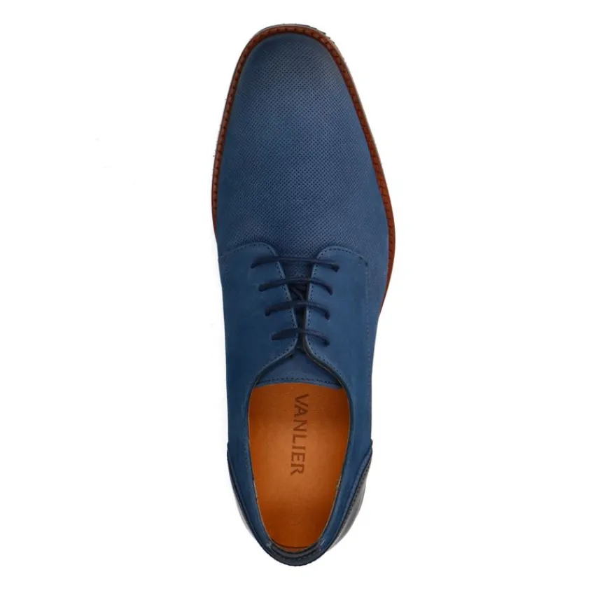 Blauwe nubuck veterschoenen van Van Lier met een platte hak van 2 cm en leren detail op de achterzijde. We adviseren als verzorging en bescherming de suède/nubuck spray in transparant.